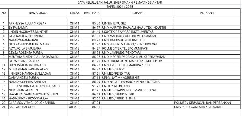Sekolah Menengah Atas Negeri 6 Pematang Siantar yang beralamat di jalan Cadika Kota Pematang Siantar Berhasil lulus kan siswa/i Terbaik nya melalui Seleksi Nasional Berdasarkan Prestasi Tahun 2025 dengan hasil baik dan Melebihi Ekspektasi awal.