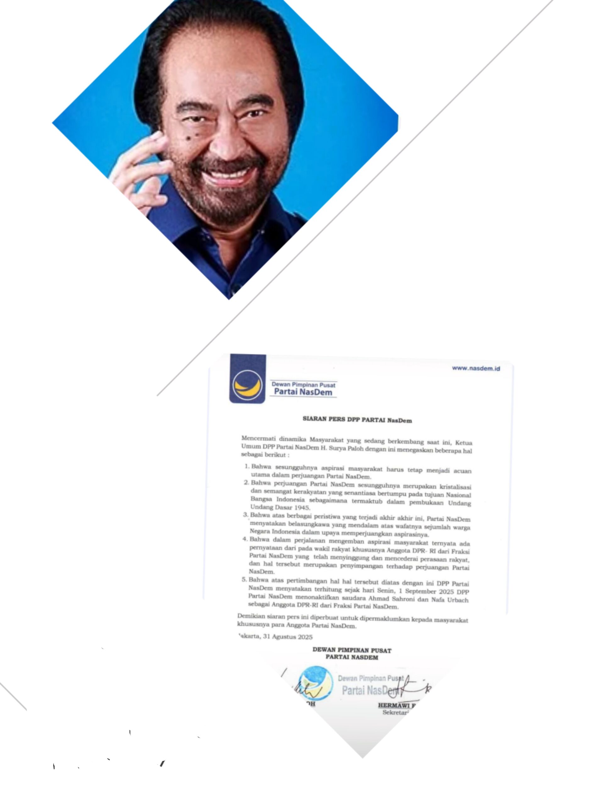 KPKM-RI menilai Keputusan Ketua Umum Partai Nasdem Surya Paloh menonaktifkan Ahmad Syahroni Dan Nafa Urbach Sebagai Anggota Dewan Perwakilan Rakyat Indonesia adalah Sebuah Keputusan Seorang Negarawan yang lebih Mendengar kan Aspirasi Rakyat daripada Oknum – oknum yang Menjadi Bagian Partai Nasdem, ini juga Sebagai Pengingat Bagi Seluruh Pengurus Partai NaSDem Di seluruh Indonesia agar tidak memberi kan statement yang melukai Hati Rakyat Indonesia.